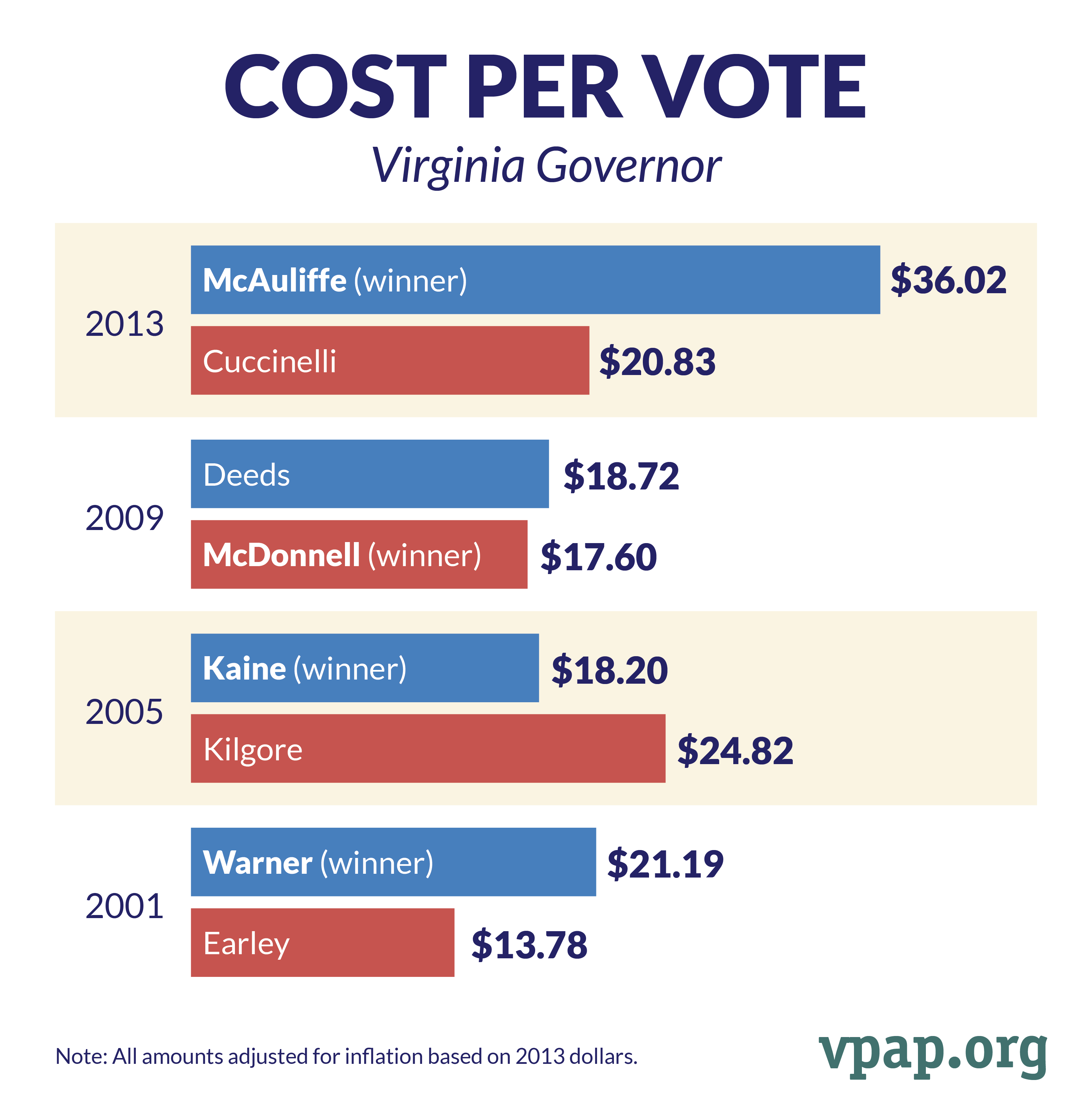 This graphic compares the amount spent per vote received by each candidate for governor.