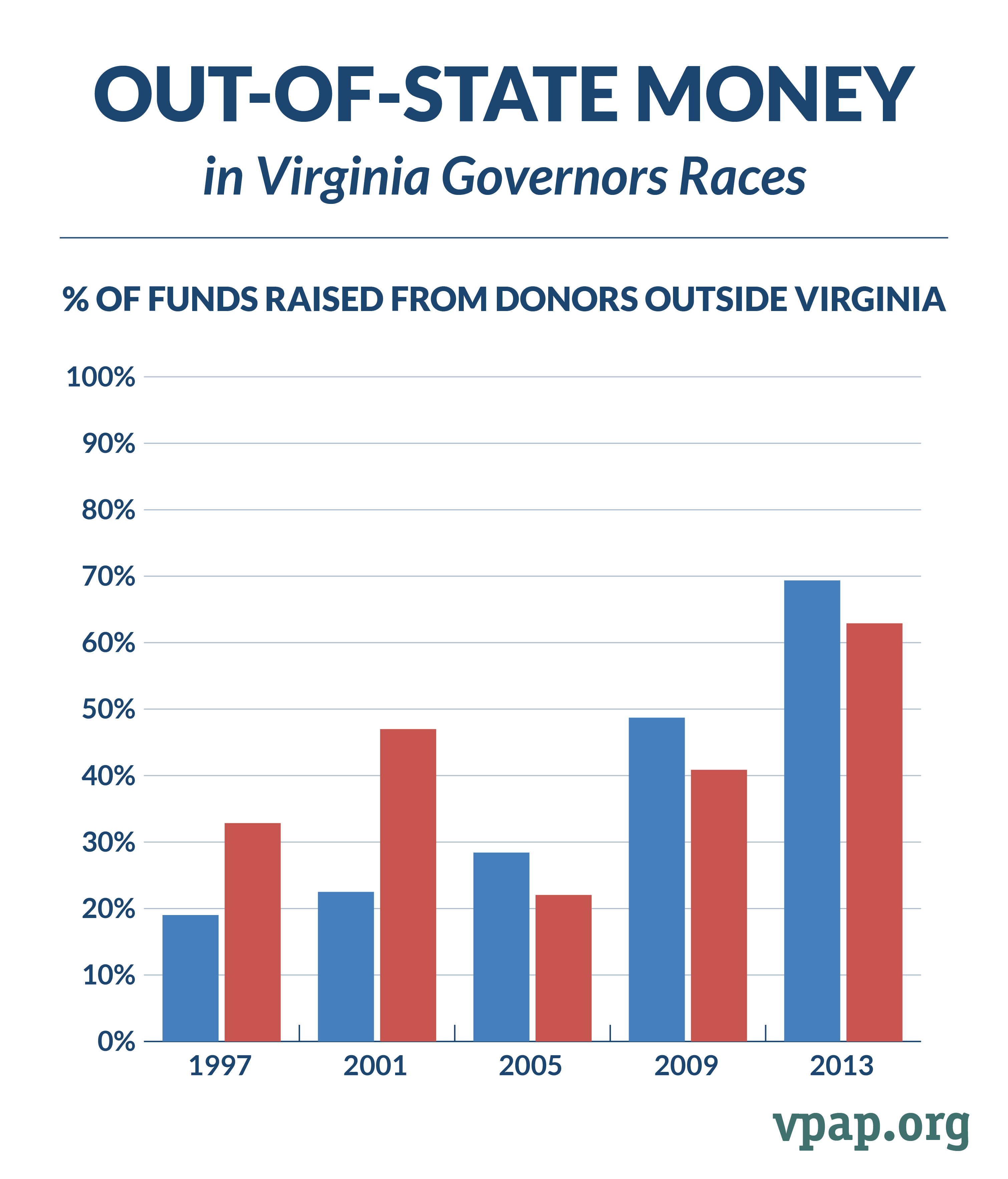 This graphic compares the percentage of money gubernatorial candidates raised from donors outside of Virginia during the last five election cycles.