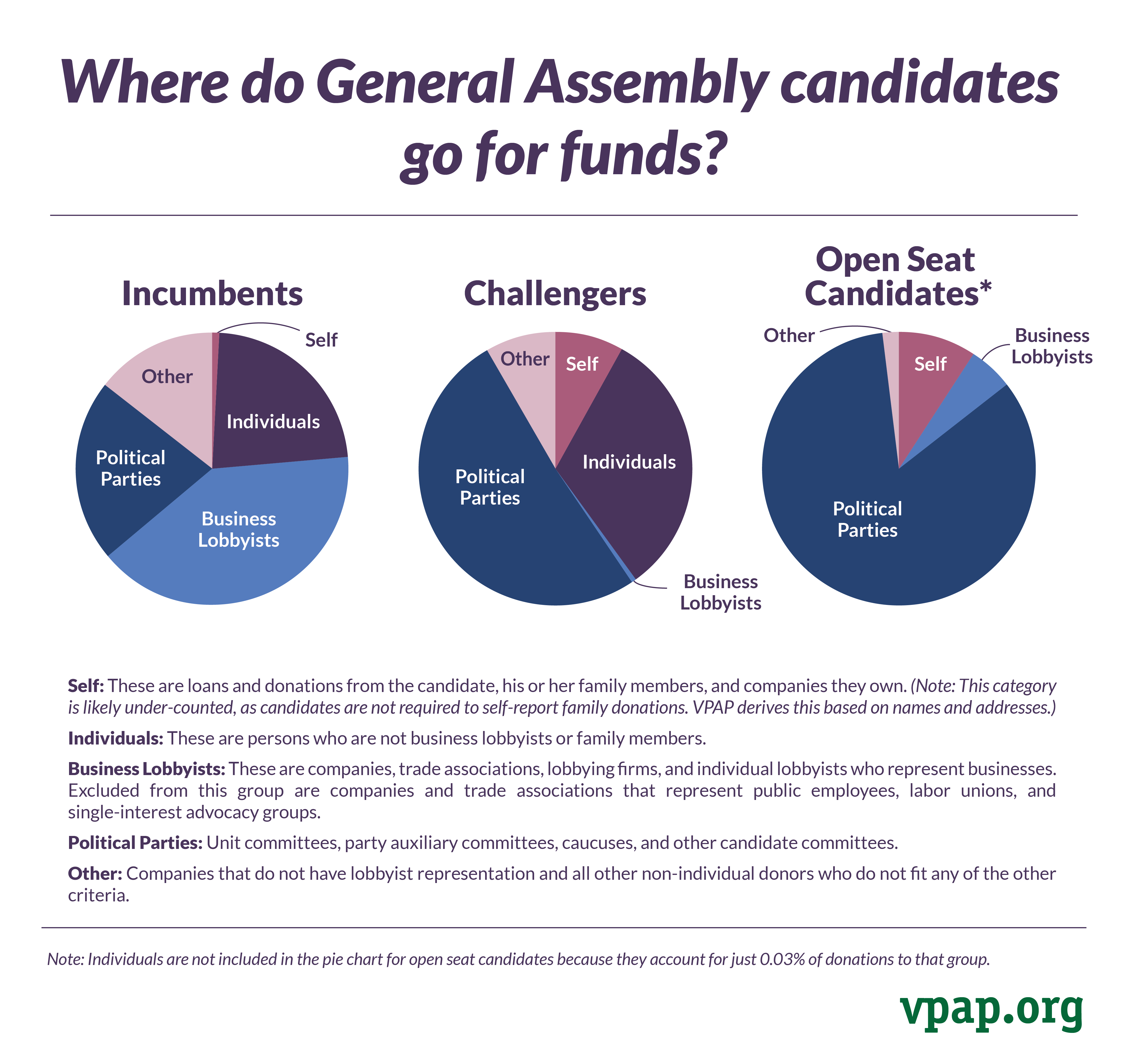These charts compare the different sources of money for General Assembly incumbents, challengers, and open seat candidates.
