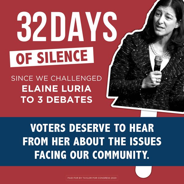 We challenged Elaine Luria to a debate over 30 days ago. Crickets. How can she represent our district effectively when she isn't willing to stand on a debate stage and discuss the issues. Now more than ever, we need to know where she stands on the issues. Sign our petition, share this with your friends and family, and let's pressure her to do the right thing and agree to debate.