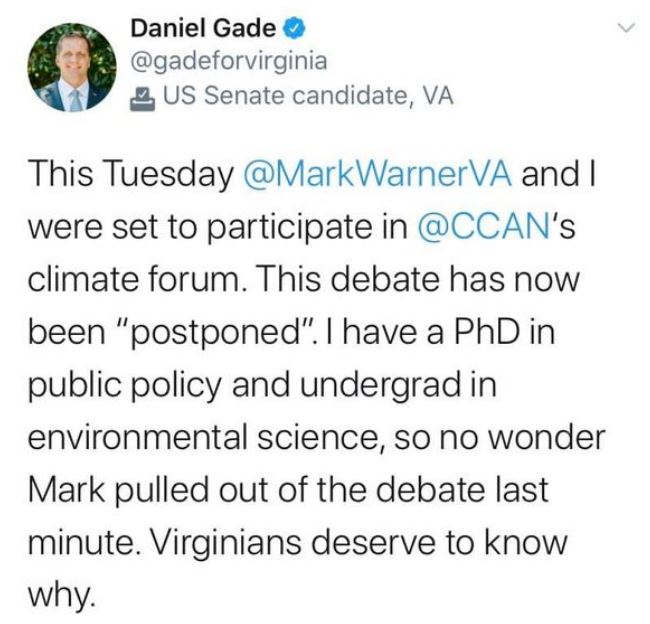 “What Virginians have this year is a stark choice between a career servant, that’s me, and a career politician, that’s Mark Warner,” Gade said. “I think people are sick of career politicians because we see year after year things staying the same or getting worse and everybody’s sick of it, and fundamentally, that’s the difference between the two of us.”