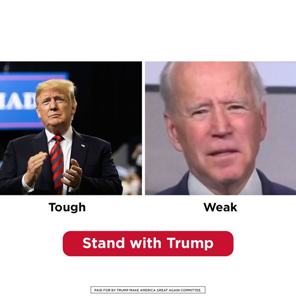 [VPAP Note: this is a group of ads that have the same image and "Stand with Trump" message, but the text under Trump and Biden varies, e.g. Trump = Tough and Biden = Weak, or Trump = American Patriot and Biden = Career Politician, or Trump = Relentless and Biden = Out of it, etc.]